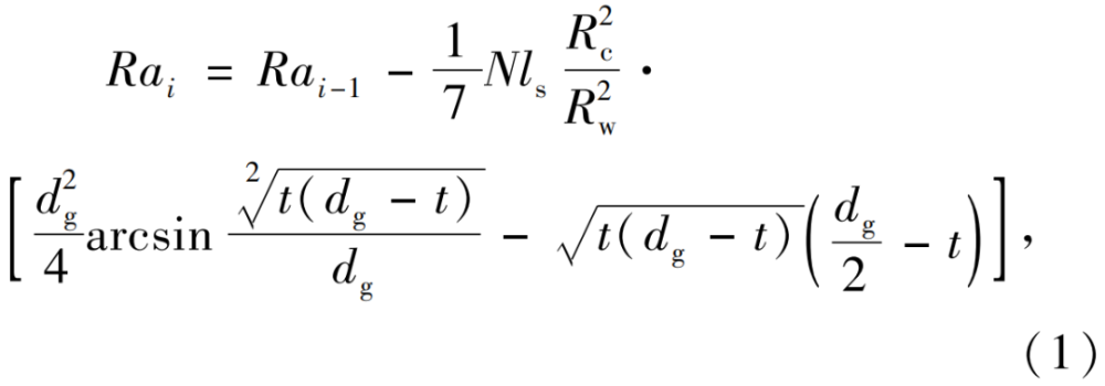 在磨料流加工中,假定工件內表面輪廓均勻,初始表面粗糙度為Ra0,并且磨料在壓力作用下沿工件內孔的軸線方向往復移動,劃痕方向上的峰谷粗糙度Rt0與算術平均表面粗糙度Ra比值恒定。假定Rai為第i次加工后獲得的內孔表面粗糙度,其模型可由(1)式計算,即