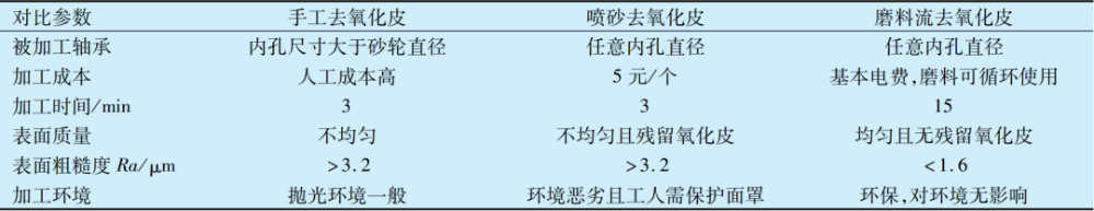 基于上述試驗結果,將磨料流去氧化皮方法與傳統手工和噴砂去氧化皮進行對比,結果見表1,采用磨料流加工方法去除氧化皮的經濟性和加工質量均明顯優于其他2種,且磨料流加工法更環保,但加工效率略低于其他2種。