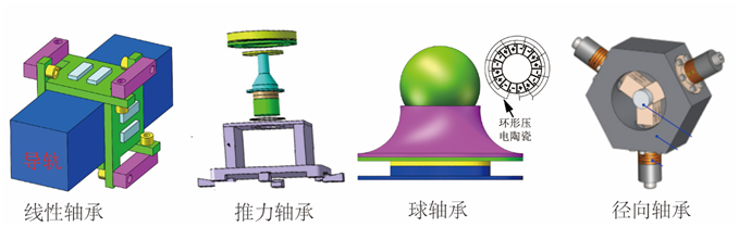 當前,對于擠壓膜氣體軸承的研究主要集中在潤滑機理分析和軸承結構改進上。對于潤滑機理的研究主要從兩種理論進行分析,分別是聲輻射理論和流體潤滑理論。由于流體潤滑理論便于分析轉速對擠壓膜氣體軸承特性的影響,因此,被大多數研究者采用。對于擠壓膜氣體軸承結構的改進上,研究者分別提出了擠壓膜氣體線性軸承、擠壓膜氣體推力軸承、擠壓膜氣體球軸承、擠壓膜氣體徑向軸承,如圖6所示。